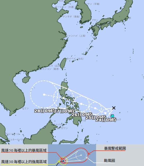 日本氣象廳已於上午發布烈風警報(Gale Warning),預估熱帶性低氣壓強度持續增強,最快會在24小時內可能就會形成颱風。目前預估未來會向西北方向移動,朝向菲律賓前進。