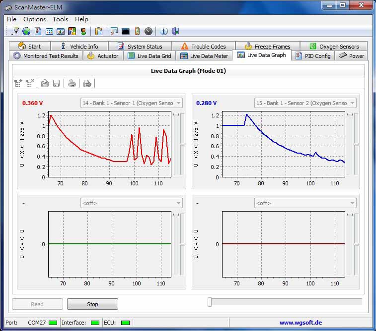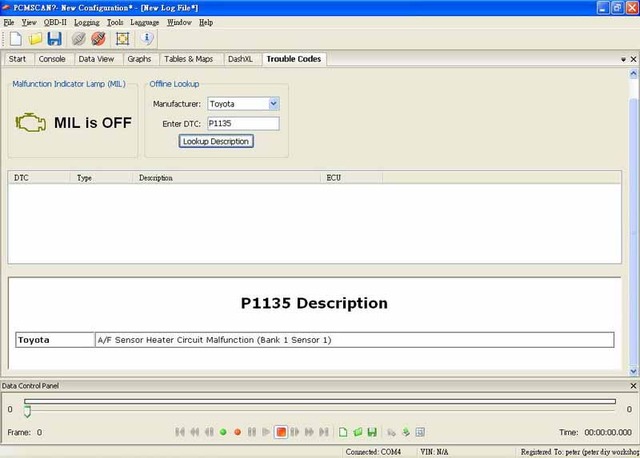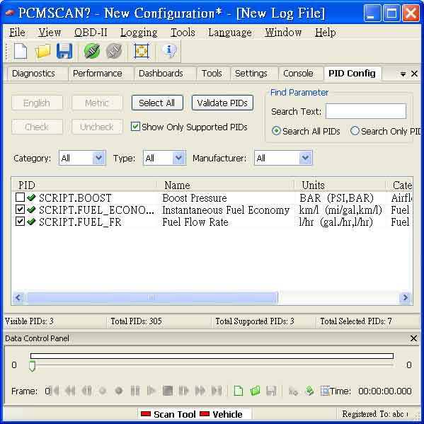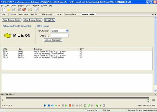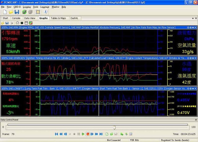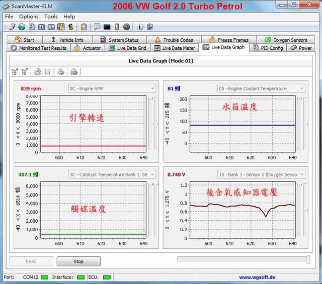 ELM327 藍牙標準版 1. 可讀取超過3000個以上的汽車廠商標準診斷故障碼及特殊診斷故障碼 DTC 通訊協定 手機使用ELM327藍芽版/軟體測試成功統計 驅動程式 1. Windows XP: 商品內容: 1. ELM327 OBDII 汽車診斷介面卡 問與答: Q:汽車術語 Q:Suzuki 2004 XL-7 (日本進口,日規) 不知能不能用 Q:請問三菱的98自排威力廂車1100CC,可用嗎? Q:我需要2組接頭 Type B (J1962) 的可以嗎 ? Q:請問之前有人詢過Toyota Yaris是否可用,請問可以用嗎? 我的是2007年款的.謝謝~ 再請問一個問題,如果引擎熄火該裝置是否會自動斷電?印象中不斷電好像會吃50mA左右的電. Q:請問98` SUBARU Impreza 2.0 turbo可用嗎?...3Q... Q:請問1995 VW PASSAT 2.0/GOLF 2.0都可以直接用嗎? Q:請問此款的韌體能更新嗎...3Q... Q:那裡可買的到軟體部分??? Q:請問06 MAZDA 5 可用嗎? 可看到發電機發電狀態嗎? Q:請問有OBD1(ALDL)的傳輸線嗎?要給1994 SATURN SL2用的.3Q Q:有附中英文故障碼清單嗎? Q: 我有安裝OBD2 抬頭顯示器, 透過抬頭顯示器再轉接ELM327藍芽, 卻只有幾個項目可以讀取到. Q:三菱virage1.8 1999年的可以用嗎? Q:1996 Nissan March的可用嗎? Q:請問有1990 三菱 ECLIPSE的 OBD1藍芽介面嗎?要給ANDROID手機上 MMCDROID軟體用的。 Q:請問02的FORD WINDSTAR3.8可以用嗎?還有含氧感知器接頭是要用01的還是02的 Q:老闆您好, 我手機上已裝好torque 最新版1.4.46 軟體, 請問我可以過來測試看看連結的狀況嗎? 2003 jimny Q:請問 2005.的TEANA2.3 跟今年的Fortis 1.8適用這個裝置嗎?連線是用 HTC DHD Q:請問一下IPAD 有程式可以用嗎? iOS 4.2.1 ,車款是Focus TDCI 2006 , 想要接的是IPAD 3G 版. A:iPad 不支援藍芽, 請使用ELM WiFi (Vgate CLK). 支援2006 Ford Focus TDCI, 但iPad 不支援藍芽. 請改買Vgate CLK Wifi. Q:那windows mobile 6.5系統可以用嗎? Q:看了統計表並不是很懂.所以還是跟您請教一下.車款:2002 CEFIRO(A33)2.0 軟體:ANDROID 系統,是否合用此產品? 還要加購甚麼? Q:請問ELM 327 1.3A版與ELM327 1.4版有何差異??順便一提這個產品能連結iPHON4嗎??問題較多,因要選擇正確購買,煩請說明了. Q:當我車上同時有其他藍牙裝置時, Android 手機軟體Torque無法找到ELM327藍牙, 雖然Android 手機已找到ELM327藍牙, 也配對成功. >Q:Ford Focus MK2 使用ELM327 需如何跳線? 現貨面交自取: 診斷軟體截圖: PCMSCAN 是我所見支援ELM327晶片的軟體中, 相容性最好的, 功能也很完備詳盡. ▼PCMSCAN 於2009年與SCANXL 整合, 囊括更多車款與診斷功能. ▼PCMSCAN: ▼PCMSCAN以圖型顯示資料, 也可自定義圖型外觀. 要記得先在PID Config選好項目喔. 能運算油耗, 是全家爬山時不可或缺的工具, 才不會半路沒油. (中文版的耶, 我也想要啦) ▼PCMSCAN: 這是扭力曲線圖,需要先輸入輪胎規格(Tire Specifications)及車的淨重(Vehicle Mass=curb weight 整備重量(生產線)+additional weight承載重量(油料+人員+雜物)) C=輪胎結構 ▼PCMSCAN: 這是車行老師傅抓問題時常看的曲線. O2 sensor 曲線若異常會耗油喔. ▼PCMSCAN: 這個是ECU裡的參數值表, 沒試過, 不知道能不能自由修改. ▼PCMSCAN: 這是查看已故障以及偶而故障的零件項目, 也可以消除儀表板上的亮燈. ▼PCMSCAN使用範例: 以2003 Hyundai Elantra 1.8示範, 里程表約13萬公里. 先切到[Settings]>[PID Config]>[Select all]>[Check]將PCMSCAN掃描到的PID全部打勾, 用來要求ECU送出所有項目的數據及狀態. Long Term Fuel Trim /LTFT (圖片上的 LONGFT1/LONGFT2) 參數是判斷噴油嘴是否髒的重要參數, 如果發現15%左右了建議清洗噴油嘴 再打開冷氣試試反應, O2S11的電壓值上下限有稍微擴大, O2S12的電壓值也有幾個小波鋒出現. 現在要開到修車廠更換O2S11含氧感知器, 再比較曲線的模式有無明顯差異 (待下回更新). ▼PCMSCAN 讀取 2010 Lexus IS250 2.5L ISO15765-4 CAN bus 11bit,簡單挑選幾項PID: AAT = 請注意: ▼Windows版Dashcommand 的主視窗畫面 (可以配合有觸控螢幕的筆電使用): Dashcommand 的Diagnostics畫面 Dashcommand 的Dashboards虛擬儀表板視窗的畫面, 也可以自行編輯畫面(免費工具軟體 DashXL), 只顯示需要的項目. ▼FiatECUScan for Alfa, Fiat, Lancia FiatECUScan 2.4.1 以ELM327 1.5 bluetooth 連線測試Alfa Romeo 147 1.9FL Diesel: ▼ScanMaster 2.1 版使用範例: 1998 Jeep Cherokee Sport 4.0 4WD >讀取排氣管含氧感知器2支(1前1後, 前sensor1, 後sensor2), 此處是自引擎冷卻時啟動, 含氧感知器是處於open loop狀態, 直到含氧感知器內加熱棒使溫度上升達到工作溫度, 電壓值會開始上下震盪. 一般需30秒, 如果加熱棒老舊 就要花較久時間來加熱, 或者燒壞了, 則訊號會是1V, ECU也會顯示相關故障碼: ▼ScanMaster 2.1 版使用範例: 2000 Hyundai Trajet 2.7 V6 讀取排氣管含氧感知器4支 (2前2後, 前sensor1,後sensor2) 底下再以 2005 Mitsubishi Grunder 2.4 示範 O2 sensor, 引擎出口的Bank1 sensor1 及Bank1 sensor 2都還正常, 訊號也還一致, 但靠近觸媒的Bank 2 sensor2 就幾乎沒心跳了. 該換了. 如果能有觸媒溫度感知器 [PID CATEMP]就更能精準抓問題了. ▼ScanMaster 2.1 版使用範例: 2006 VW Golf 2.0 Turbo Petrol ▼Youtube影片:ScanMaster-ELM OBD-2 ScanTool for ELM327 ▼ScanMaster 2.1 版的Dashboard截圖(Car PC 搭配觸控螢幕很好用喔) ▼ScanMaster 2.1 漢化中文版 ▼TouchScan 2.1.0.1 測試 2002 Nissan Cefiro A34 3.0 (感謝 Simeon 朱先生提供) ▼有Android手機的朋友不會錯過的手機藍芽用軟體 Torque Pro車況監控專業版. 如果每次連線都要重新輸入藍芽配對密碼: 藍牙 > 藍牙設定 > 掃描裝置 > 配對 > 自動連線打勾. Fuel Pressure ▼ EVOScan 2.7 支援 Mitsubishi / Subaru 車款明細 全球市場